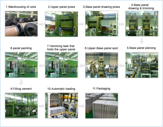 (we reserve the maximum load in Korea, when 1000Kgf is loaded, 4.0mm is deflected ) • All materials, including cold rolled steel sheet and cement are nonflammable. • weight endurance is increased due to the multi welding combination structure of upper and base panel • Used POSCO cold rolled steel sheet, which is better in durability and corrosion resistance than hot rolled steel sheet. • KS Mark, Environment Indication Certification, Excellent quality product designated by Incheon • Performance record Samsung DSR-PROJECT, Busan Culture Contents Complex, Yeonggwang Nuclear Power Plant, Uljin New Clear Power Plant, Shin-Gori New Clear Power Plant, Sangamdong new MBC building, Data Processing Room, etc. |