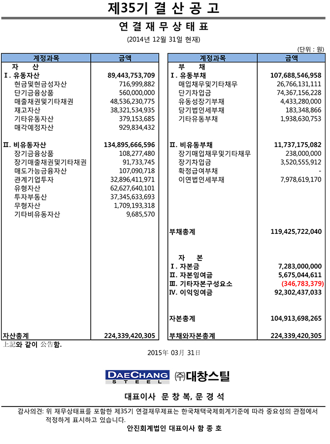 2014년 제35기 결산공고 안내