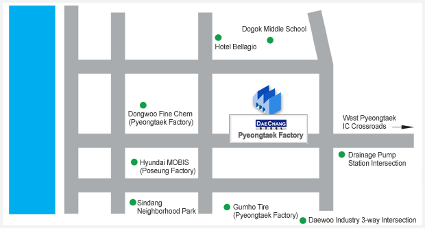 Seohaean Expressway → Seopyeongtaek IC → Turn left at Hyundai Mobis Intersection → Turn left at Yoosung T&S Intersection → Drive straight → Woogyeong Samguri(T-junction) → Asan Seawall → Make a P turn towards Dunpo, Seonghwan → Seil Steel → Drive straight → Towards Senghwan, Cheonan → Turn right 700m after (sign) |
